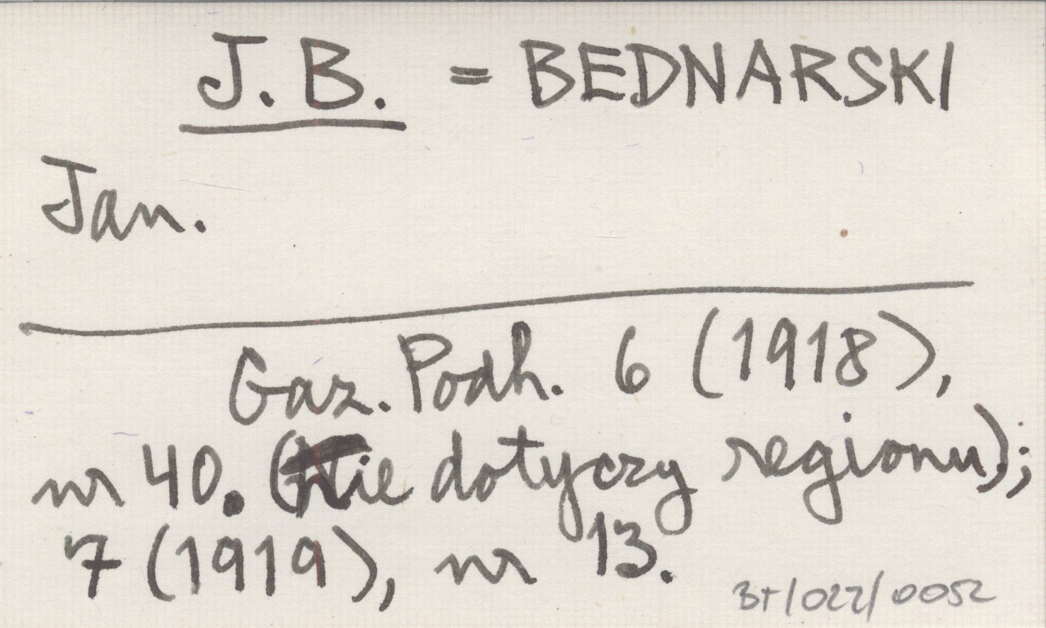 J. B. BEDNARSKI Jan Gazeta Podhalańska 6 (1918), nr 40; 7 (1919), nr 13. Nr 40: nie dotyczy regionu.