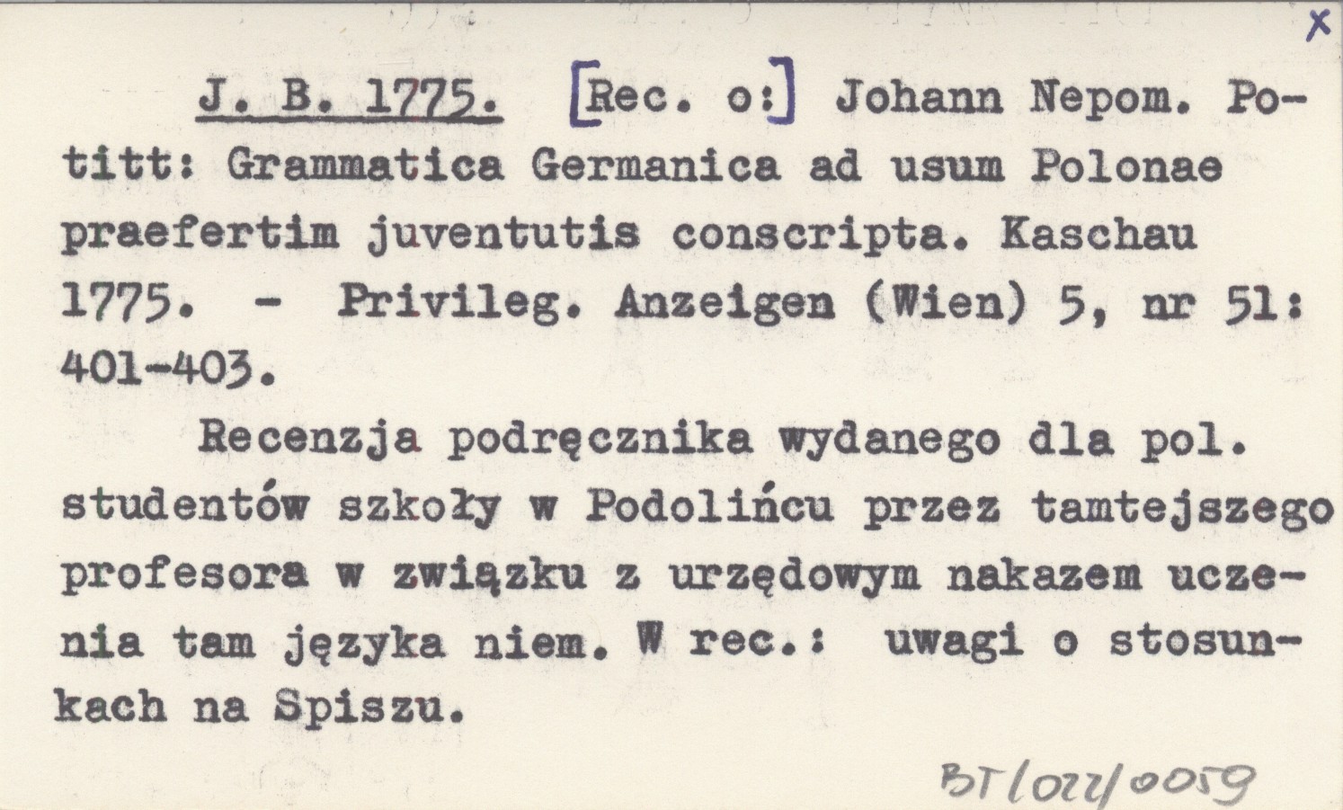 J. B. 1775 Johann Nepom. Potitt: Grammatica Germanica ad usum Polonae praefertim juventutis conscripta. Kaschau 1775.