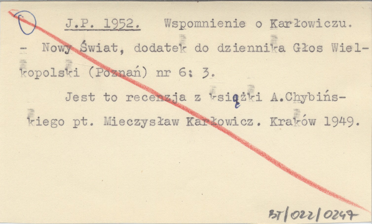 Głos Wielkopolski, dod. Nowy Świat (Poznań) , Nr 6: 3. Jest to recenzja z książki A. Chybińskiego pt. Mieczysław Karłowicz. Kraków 1949.