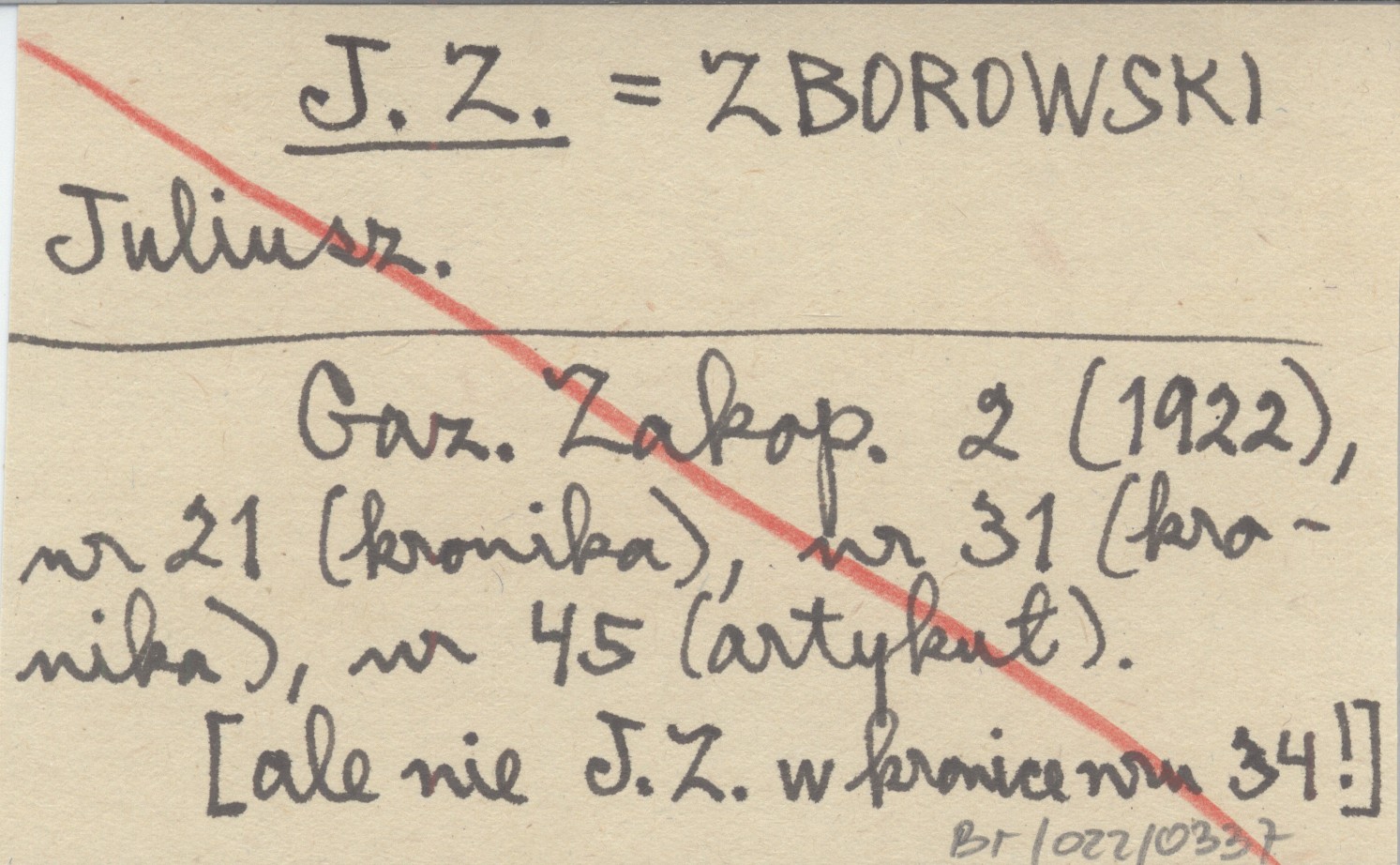 J. Z. ZBOROWSKI Juliusz Gazeta Zakopiańska 2 (1922), nr 21, 31, 45. Nr 21 i 31: kronika; nr 45: artykuł. [Nie J.Z. w kronice nr 34!].