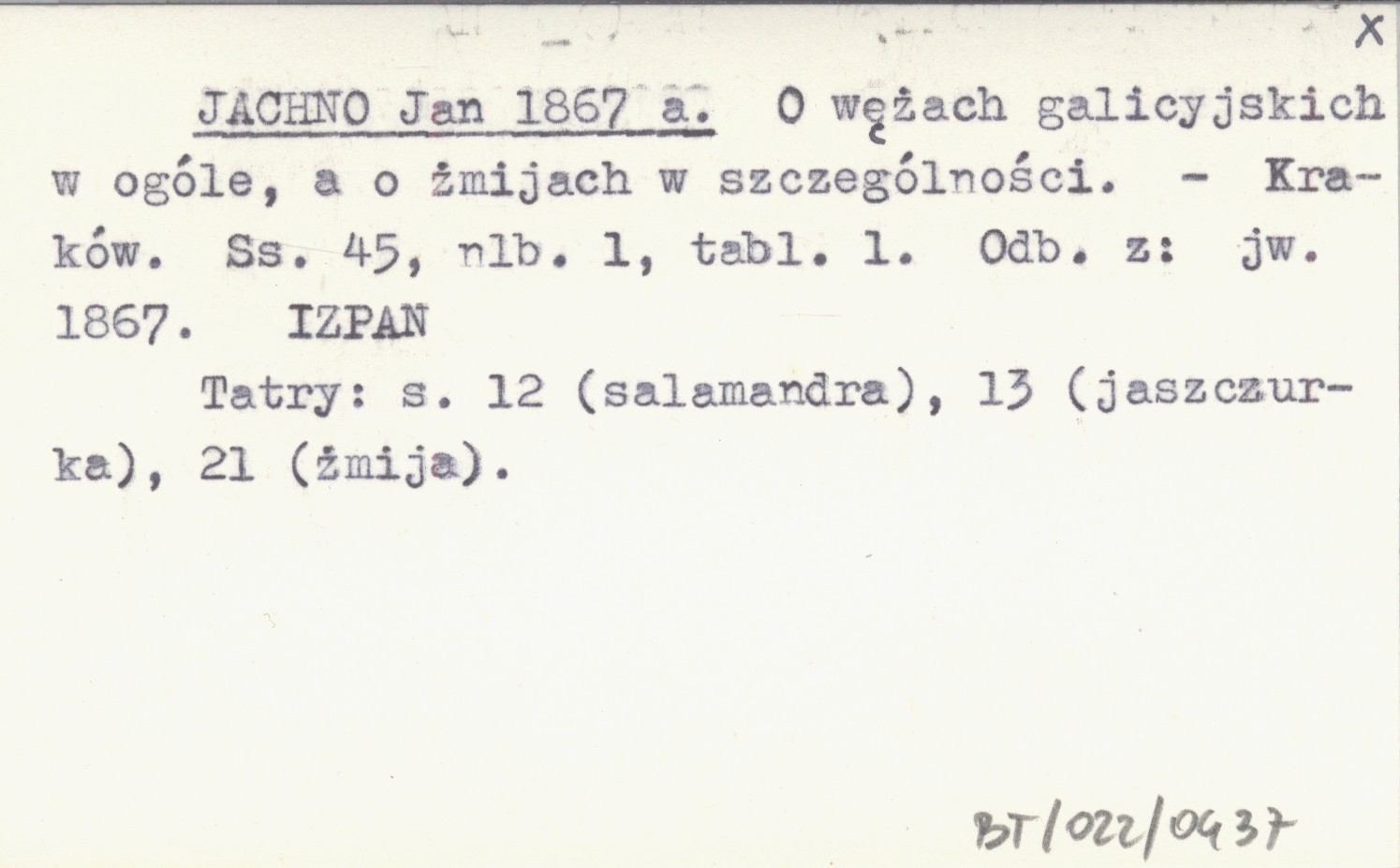 Kraków , 45 s., [1], 1 k. Tatry: 12 (salamandra), 13 (jaszczurka), 21 (żmija). Odb. z: jw. 1867.