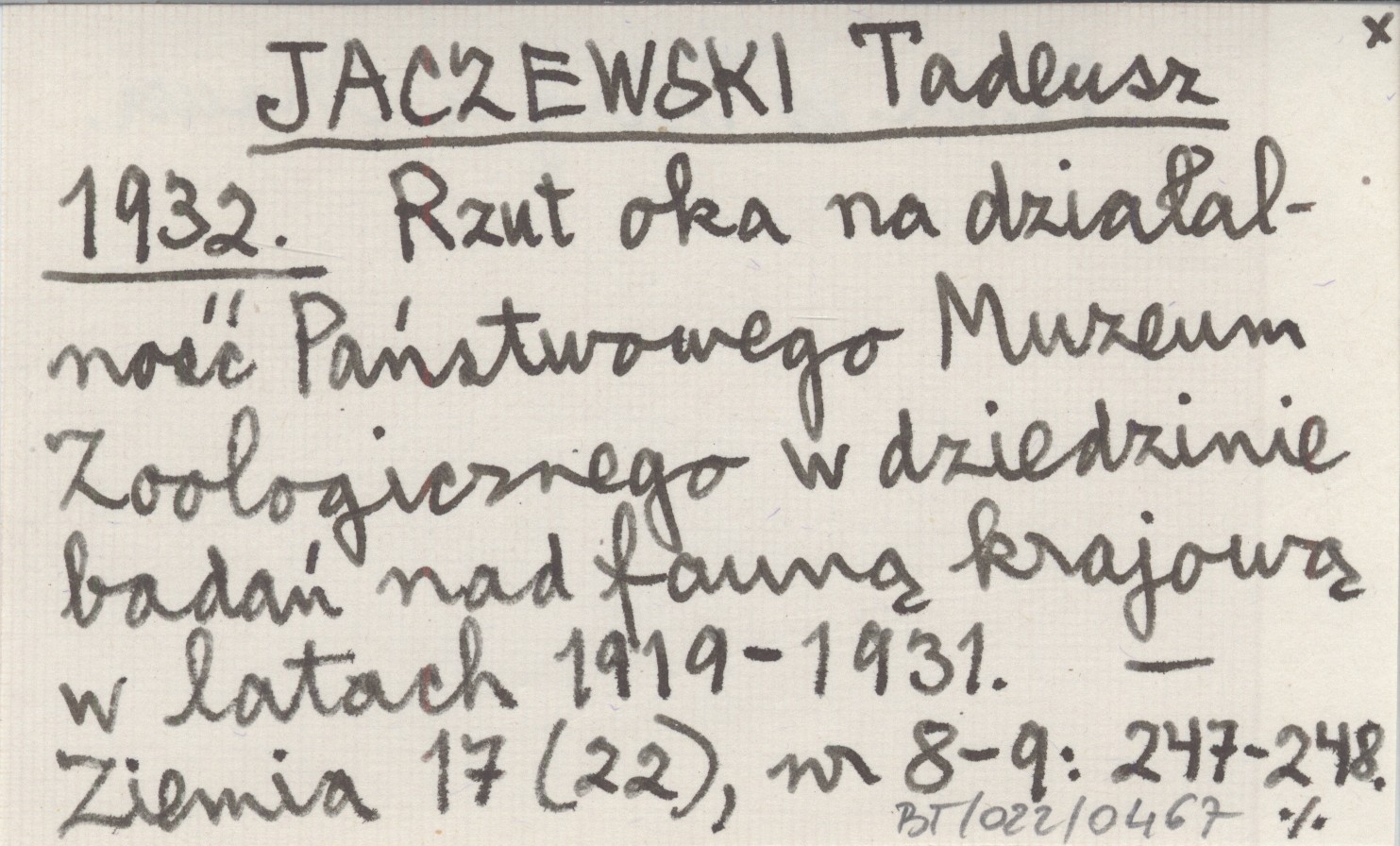 JACZEWSKI Tadeusz 1932 Rzut oka na działalność Państwowego Muzeum Zoologicznego w dziedzinie badań nad fauną krajową w latach 1919-1931.