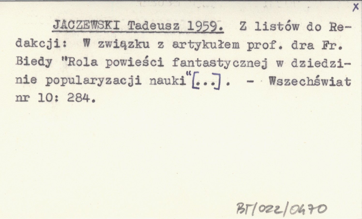 JACZEWSKI Tadeusz 1959 Z listów do Redakcji: W związku z artykułem prof. dra Fr. Biedy "Rola powieści fantastycznej w dziedzinie popularyzacji nauki" [...].