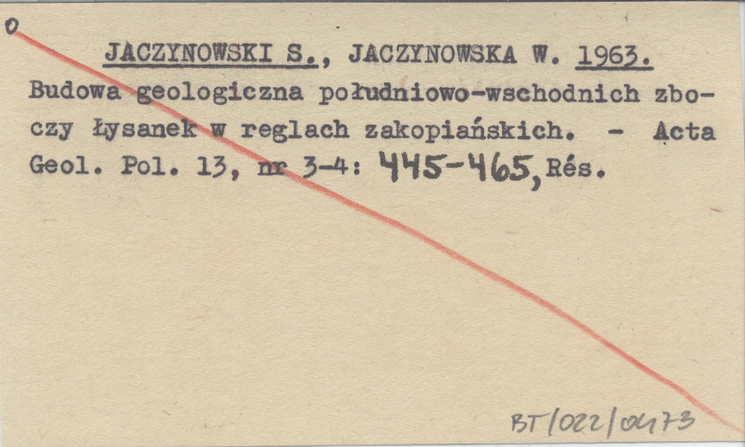 JACZYNOWSKI S. JACZYNOWSKA, W. ; 1963 Budowa geologiczna południowo-wschodnich zboczy Łysanek w reglach zakopiańskich.