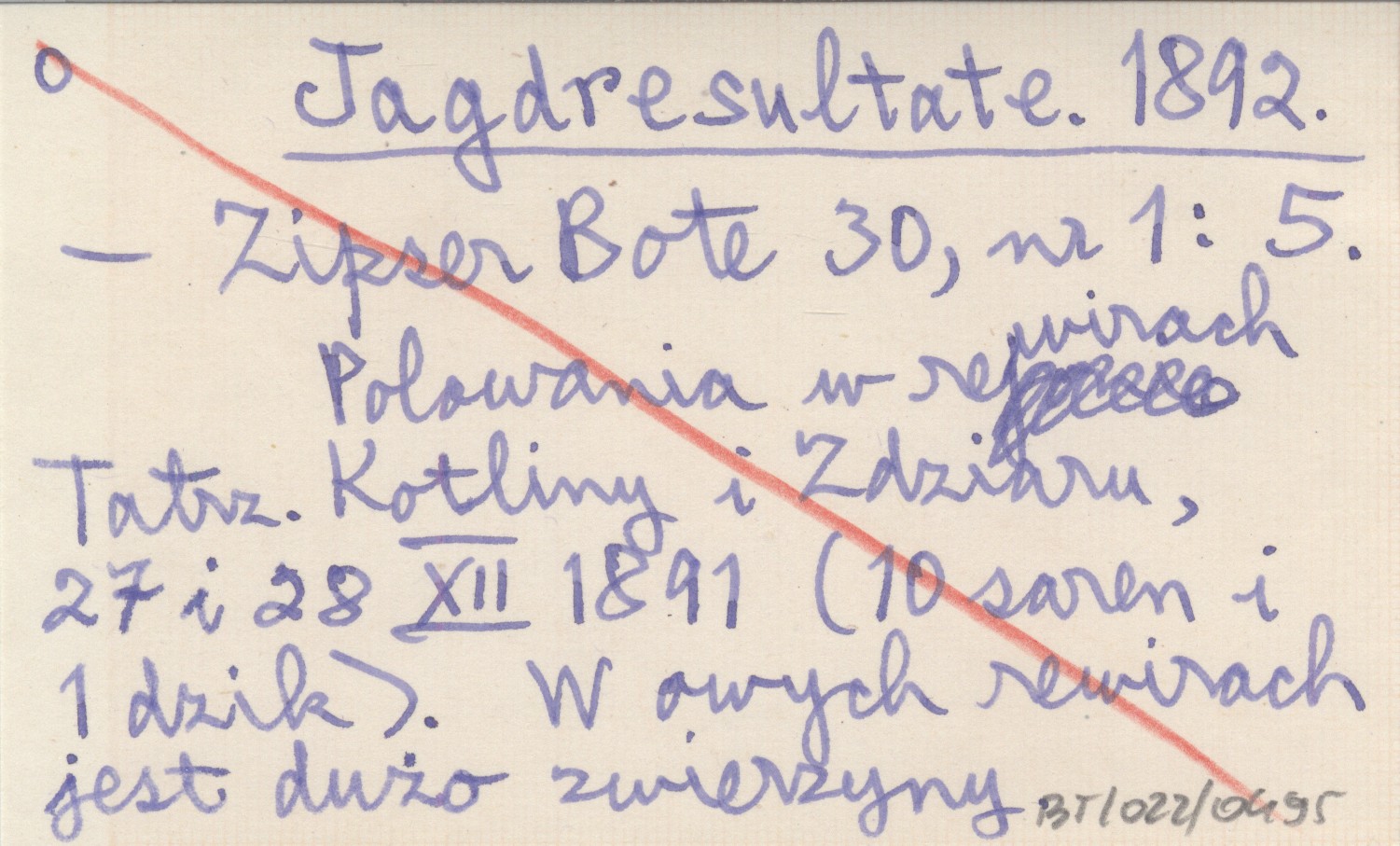 Zipser Bote, 30, nr 1: 5. Polowania w rewirach Tatrzańskiej Kotliny i Zdziaru, 27 i 28 XII 1891 (10 saren i 1 dzik). W owych rewirach jest dużo zwierzyny.