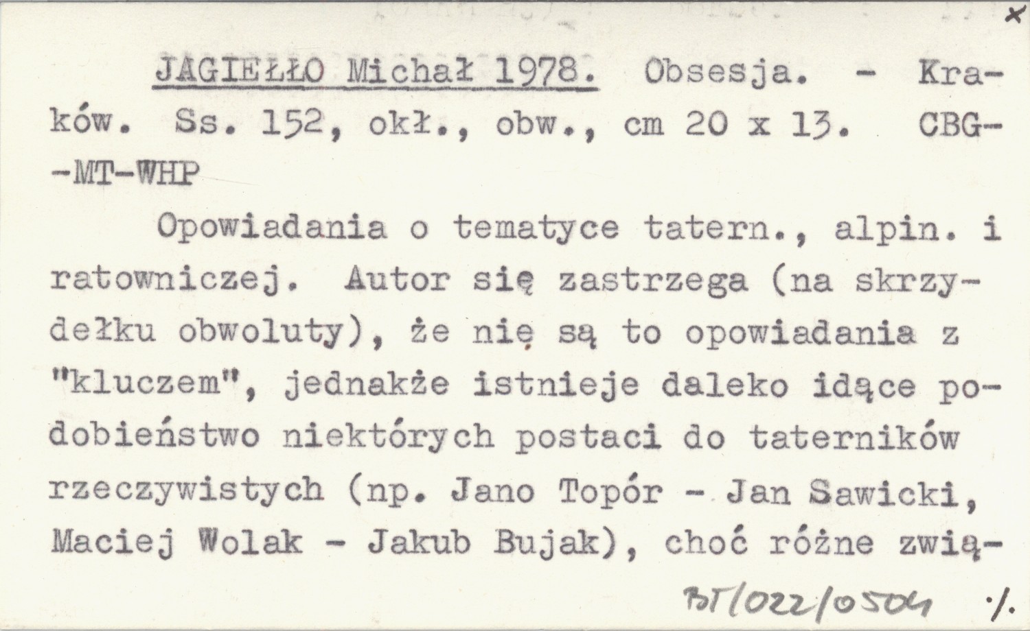 Kraków , 152 s., okł., obw., 20x13 cm. Opowiadanie o tematyce taternickiej, alpinistycznej i ratowniczej. Autor się zastrzega (na skrzydełku obwoluty), że nie są to opowiadania z "kluczem", jednakże istnieje daleko idące podobieństwo niektórych postaci do taterników rzeczywistych (np. Jano Topór - Jan Sawicki, Maciej Wolak - Jakub Bujak), choć różne związane z nimi fakty są zmienione.