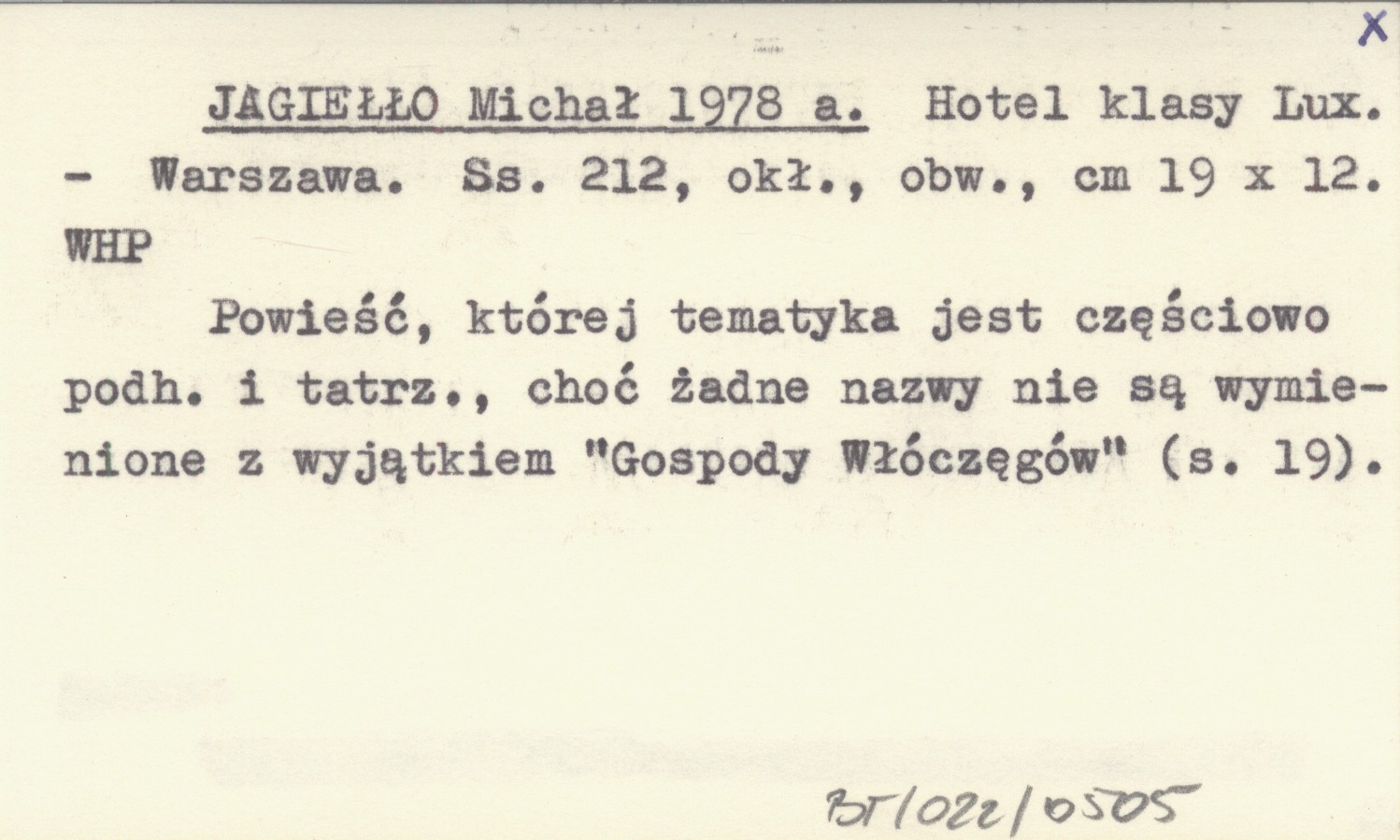 Warszawa , 212 s., okł., obw., 19x12 cm. Powieść, której tematyka jest częściowo podhalańska i tatrzańska, choć żadne nazwy nie są wymienione z wyjątkiem "Gospody Włóczęgów" (S. 19).