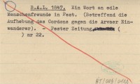 B. A. L. 1847 Ein Wort an edle Menschenfreunde in Pest. (Betreffend die Aufhebung des Cordons gegen die Arvaer Einwanderer).