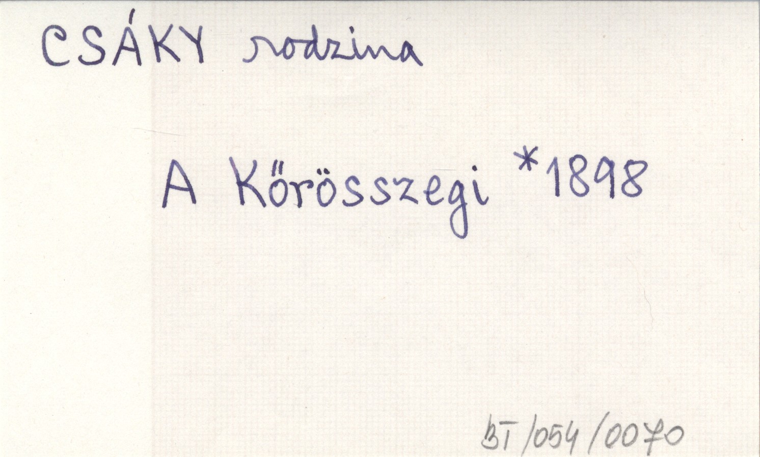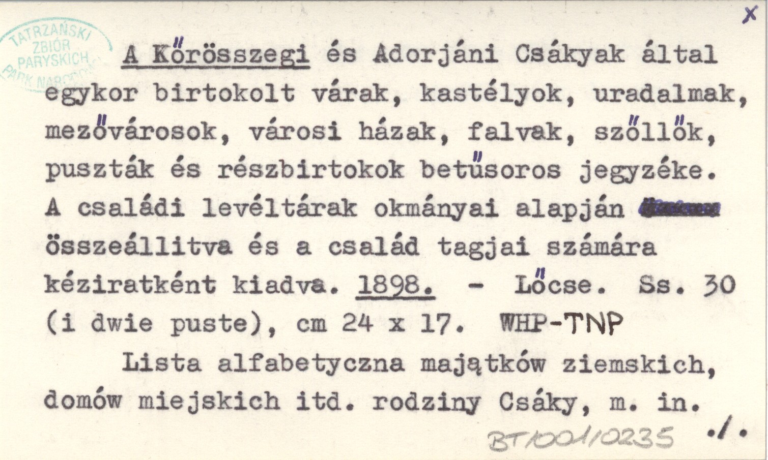 A Körösszegi és Adorjáni Csákyak által egykor birtokolt várak, kastélyok, uradalmak, mezövárosok, városi házak, falvak, szöllök, puszták és részbirtokok betüsoros jegyzéke. A családi levéltárak okmányai alapján összeállitiva és a család tagjai számára kéziratként kiadava. 1898