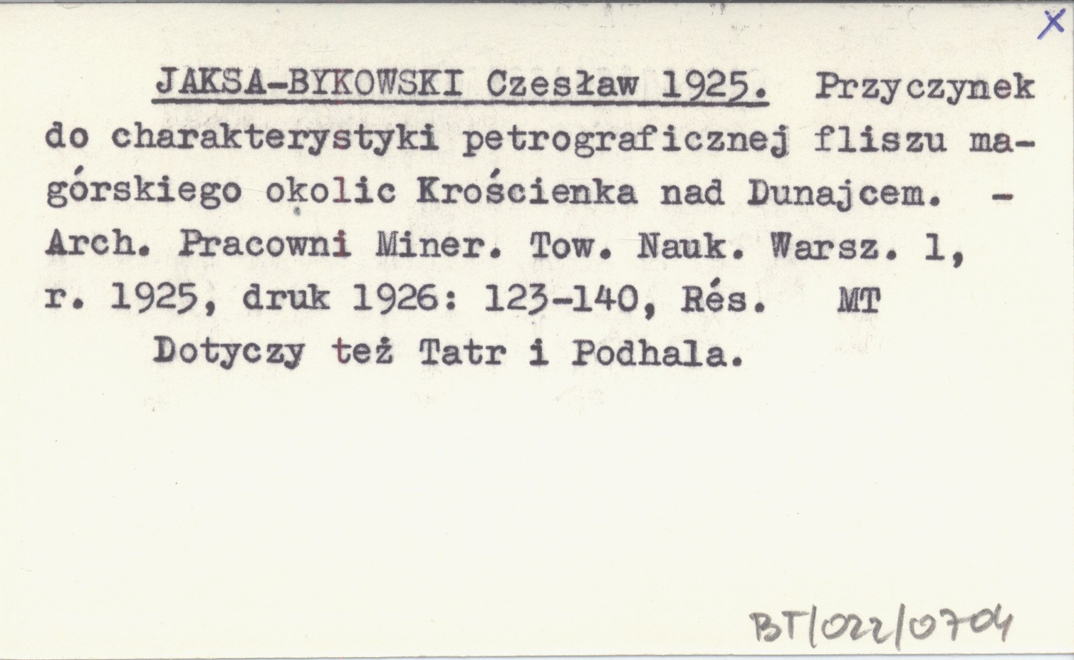 JAKSA-BYKOWSKI Czesław 1925 Przyczynek do charakterystyki petrograficznej fliszu magórskiego okolic Krościenka nad Dunajcem.