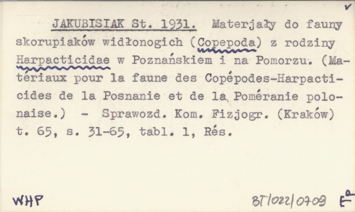JAKUBISIAK St. 1931 Materjały do fauny skorupiaków widłonogich (Copepoda) z rodziny Harpacticidae w Poznańskiem i na Pomorzy. (Matériaux pour la faune des Copépodes-Harpacticides de la Posnanie et de la Poméranie polonaise).