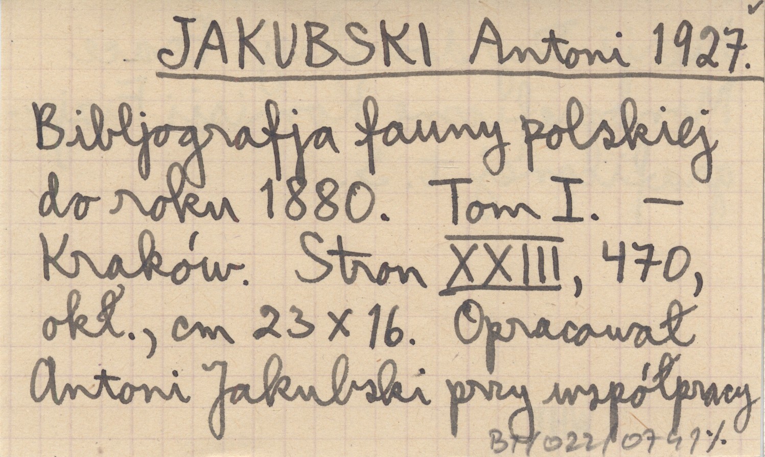 JAKUBSKI Antoni 1927 Bibliografja fauny polskiej do roku 1880. Tom I.
