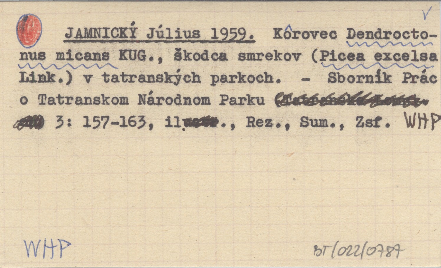 JAMNICKĘ Július 1959 Kôroves Dendroctonus micans KUG., čkodca smrekov (Picea excelsa Link.) v tatranskęch parkoch.