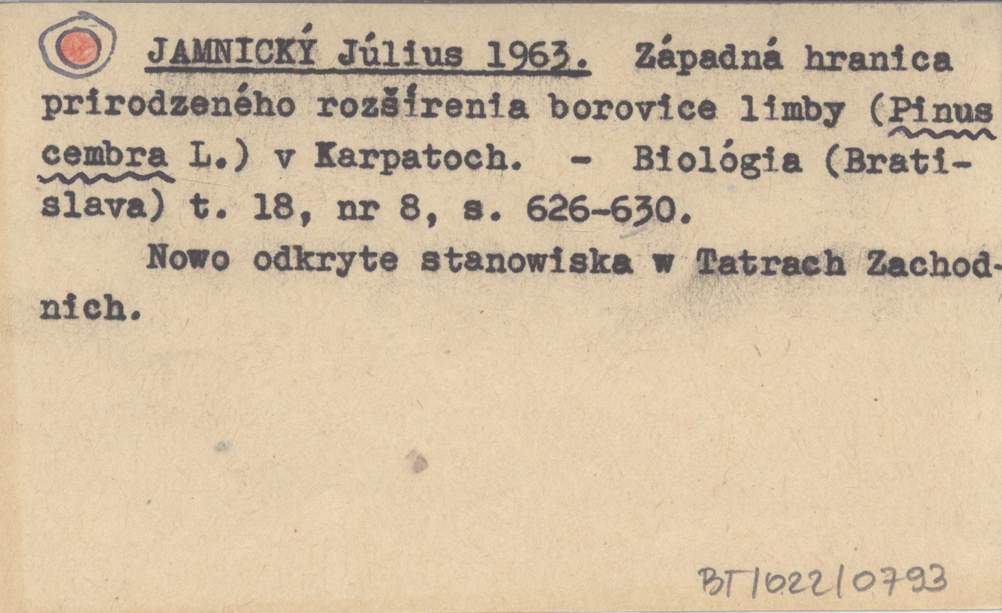 JAMNICKÝ Július 1963 Západná hranica prirodzeného rozšírenia borovice limby (Pinus cembra L.) v Karpatoch.