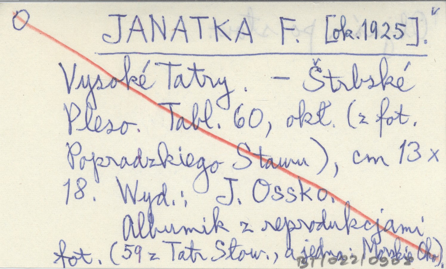 J. Ossko, Štrbské Pleso , 60 k., okł., 13x18 cm. Na okł. fotografia Popradzkiego Stawu. Albumik z reprodukcjami fot. (59 z Tatr Słowackich, a jedna: Morskie Oko). Objaśnienia po słowacku.
