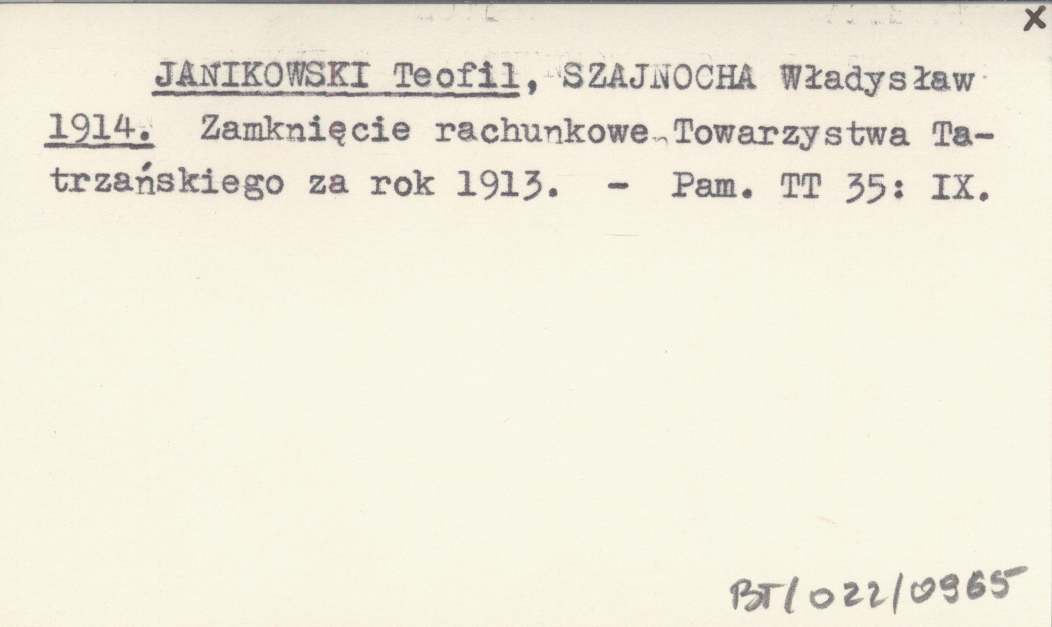 JANIKOWSKI Teofil SZAJNOCHA, Władysław. ; 1914 Zamknięcie rachunkowe Towarzystwa Tatrzańskiego za rok 1913.