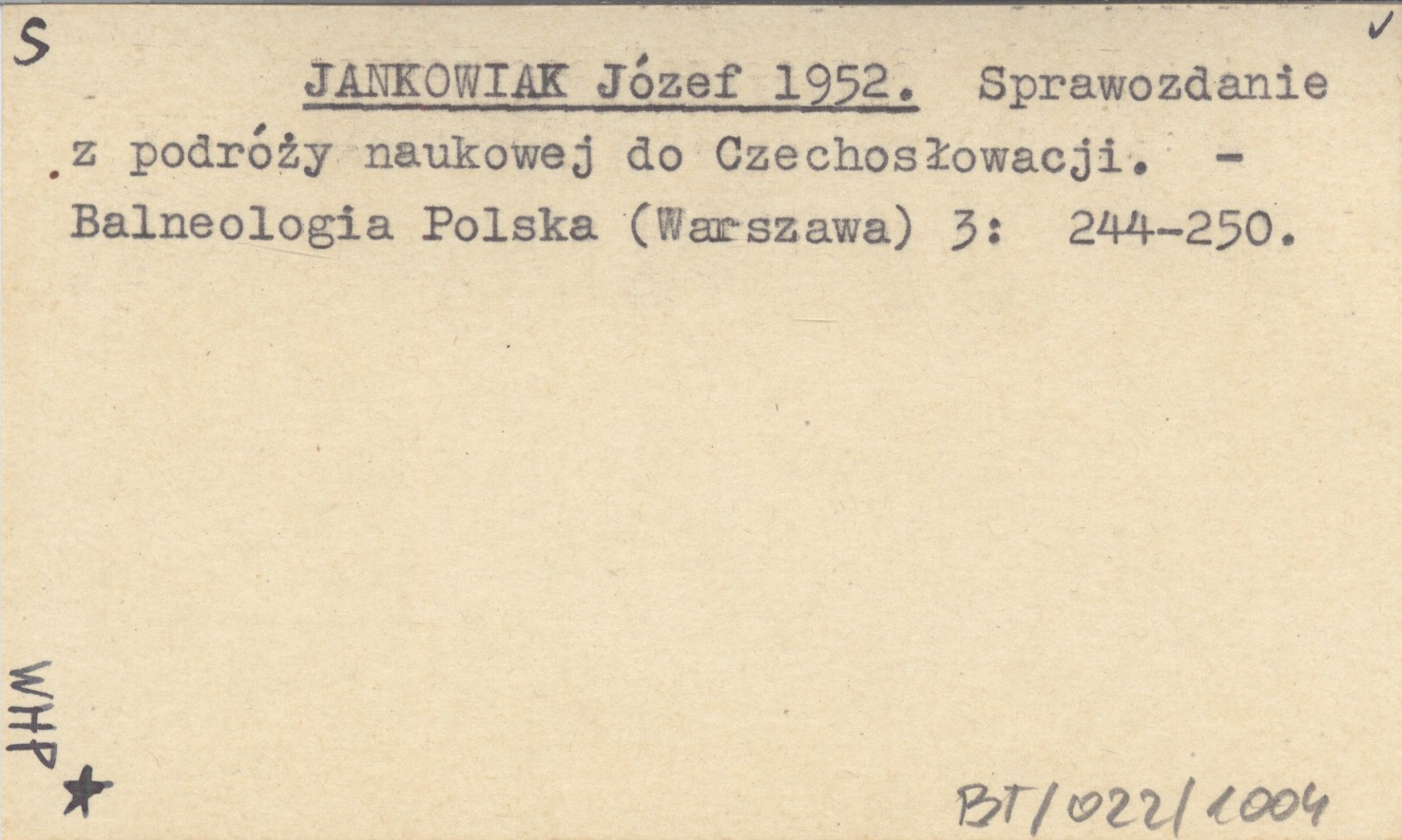 JANKOWIAK Józef 1952 Sprawozdanie z podróży naukowej do Czechosłowacji.