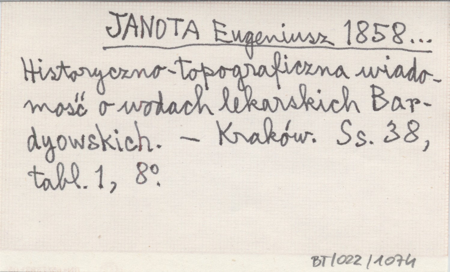 JANOTA Eugeniusz 1858... Historyczno-topograficzna wiadomość o wodach lekarskich Bardyowskich.