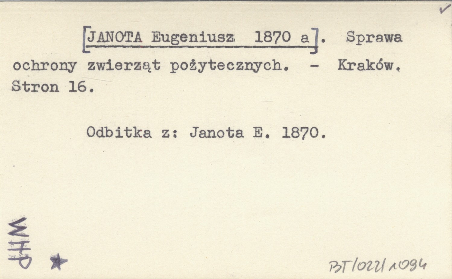 [JANOTA Eugeniusz] 1870 a Sprawa ochrony zwierząt pożytecznych.
