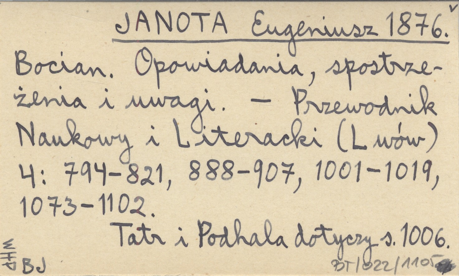 JANOTA Eugeniusz 1876 Bocian. Opowiadania, spostrzeżenia i uwagi.