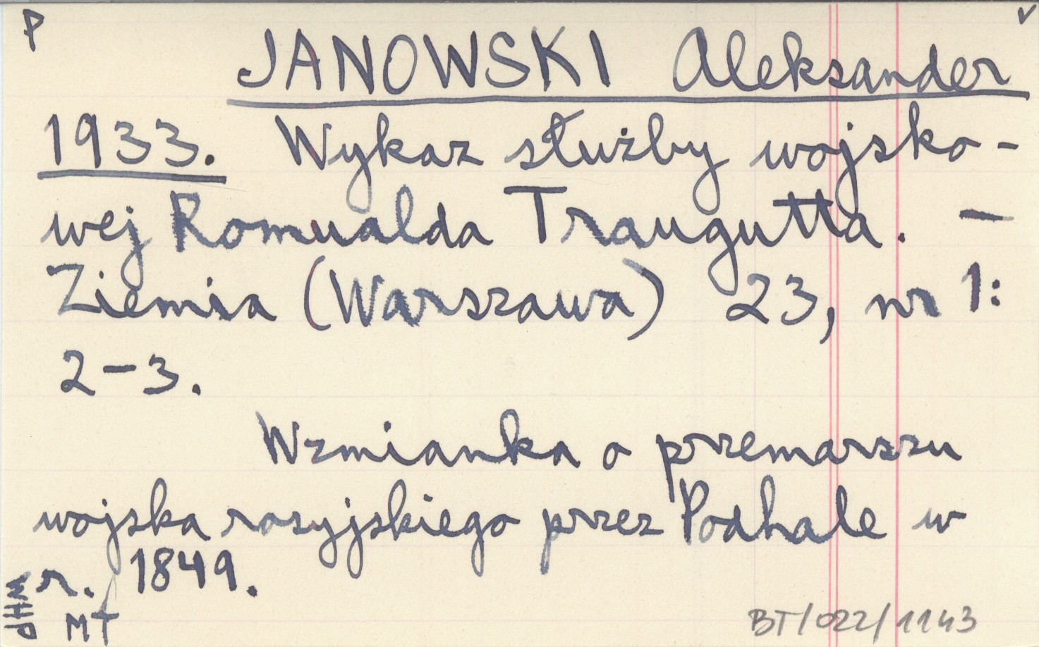 JANOWSKI Aleksander 1933 Wykaz służby wojskowej Romualda Traugutta.