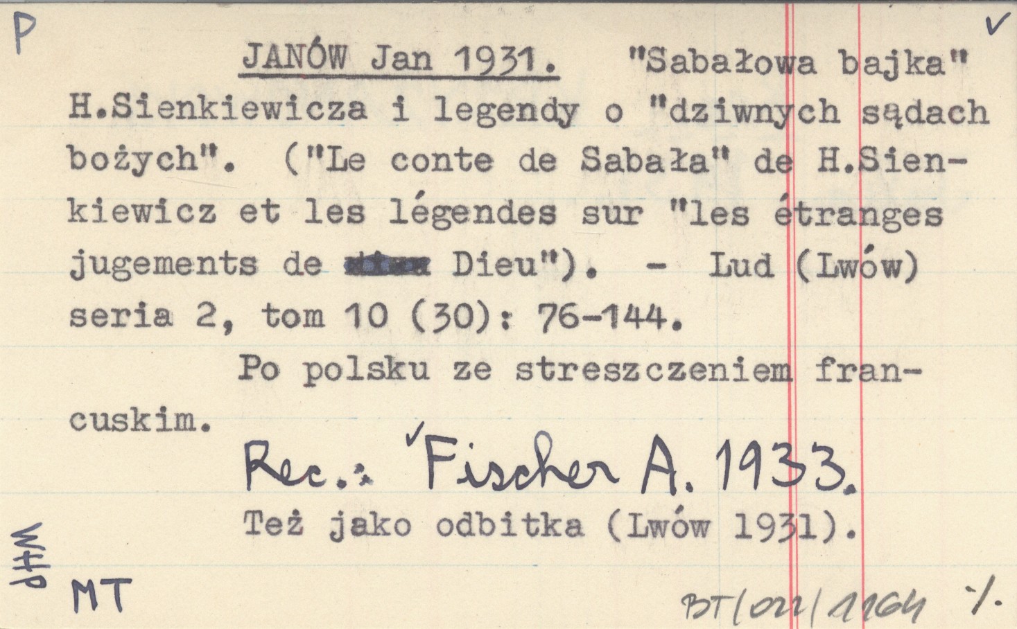 JANÓW Jan 1931 "Sabałowa bajka" H. Sienkiewicza i legendy o "dziwnych sądach bożych". ("Le conte de Sabała" de H. Sienkiewicz et les légendes sur "les étranges jugements de Dieu").