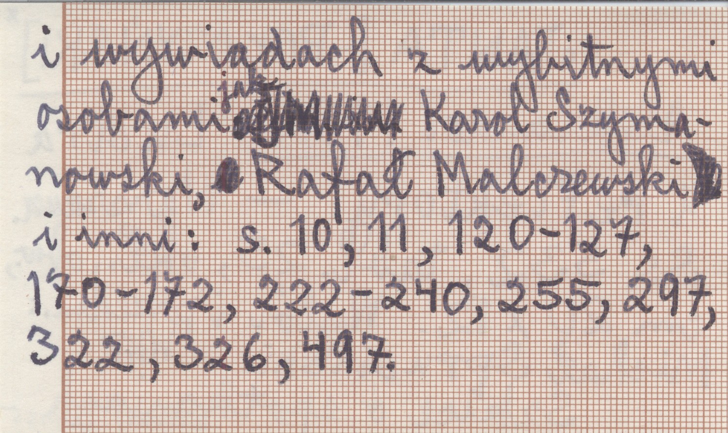 Warszawa , 532 s., 25 k., okł., obw., 20x12 cm. Szkice o spotkaniach i wywiadach z wybitnymi osobami jak Karol Szymanowski, Rafał Malczewski i inni: 10, 11, 120-127, 170-172, 222-240, 255, 297, 322, 326, 497. Wybór i przedmowa: Michał Sprusiński.