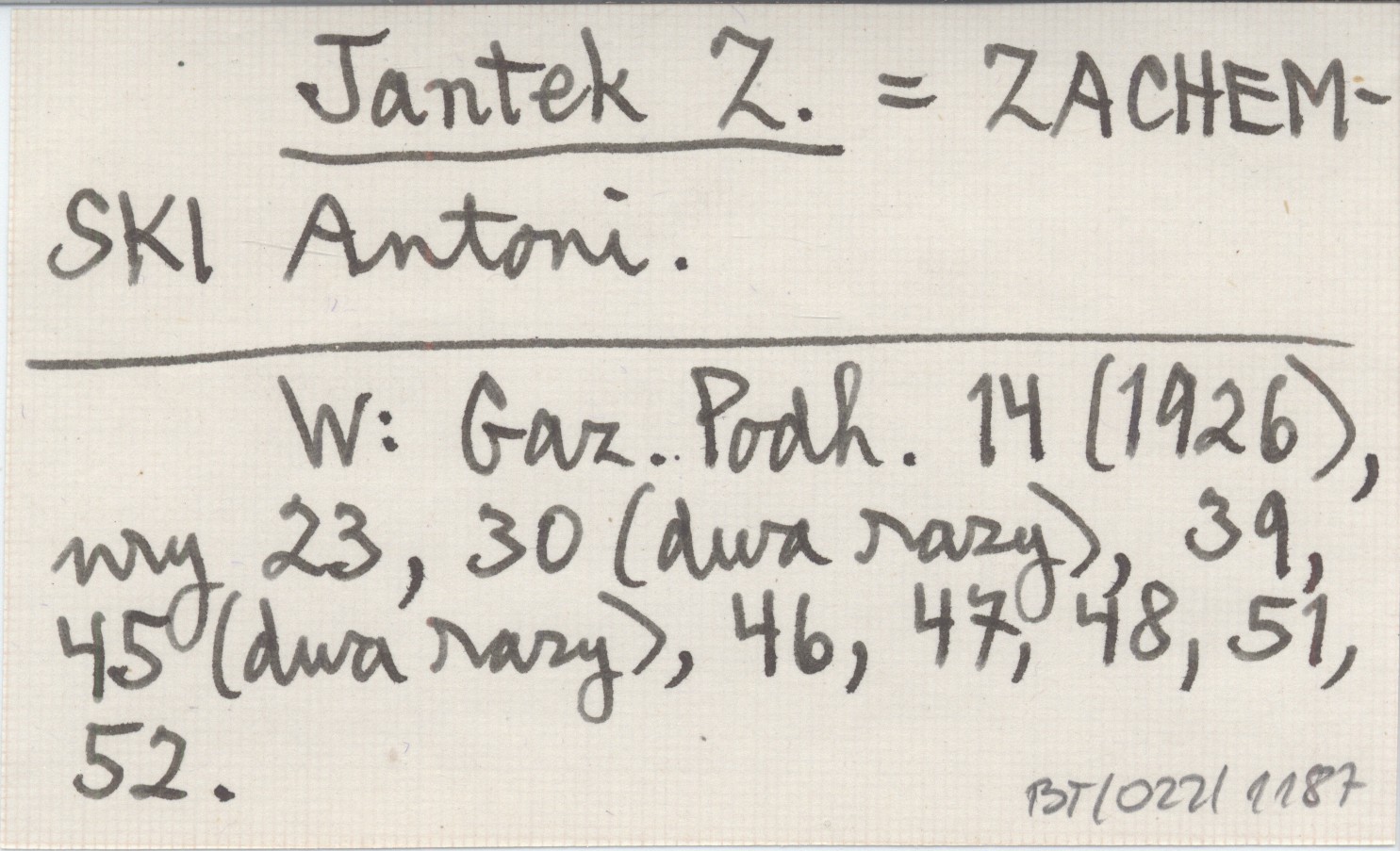 Jantek Z. ZACHEMSKI Antoni Gazeta Podhalańska 14 (1926), nr 23, 30 (2x), 39, 45 (2x), 46, 47, 48, 51, 52.