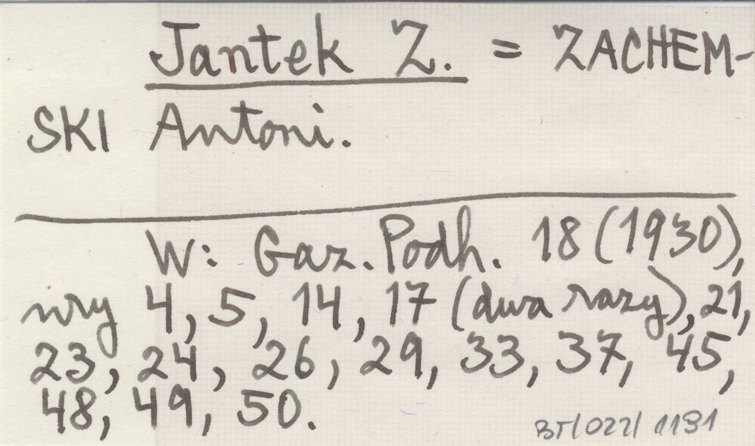 Jantek Z. ZACHEMSKI Antoni Gazeta Podhalańska 18 (1930), nr 4, 5, 14, 17 (2x), 21, 23, 24, 26, 29, 33, 37, 45, 48, 49, 50.