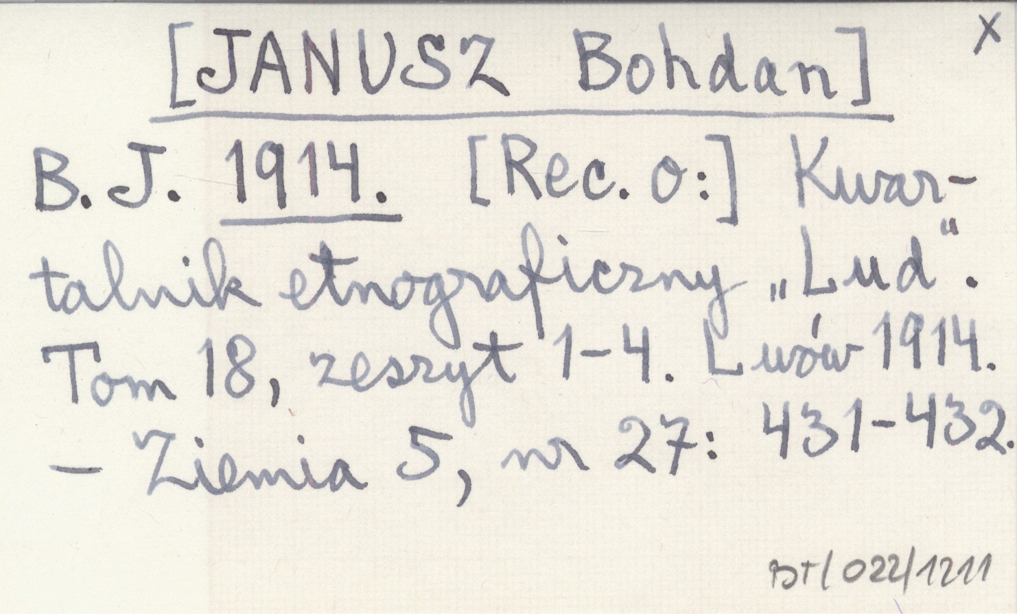 B. J. [JANUSZ Bohdan] 1914 Kwartalnik etnograficzny "Lud". Tom 18, zeszyt 1-4. Lwów 1914.