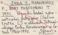 JARA Z. MARKIEWICZ, F. ; BORY MIĄCZYŃSKI, T. ; 1971 Wyniki badań zdrowotności pstrągów (Salmo trutta L.) w stawach Tatrzańskiego Parku Narodowego w latach 1966-1970.