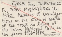 JARA Z. MARKIEWICZ, F. ; BORY MIĄCZYŃSKI, T. ; 1972 Results of investigations on the state of health of the trout in lakes of the Tatra National Park in the years 1966-1970.