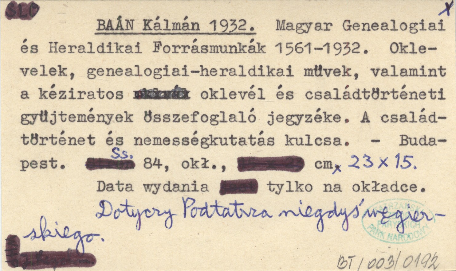 BAÁN Kálmán 1932 Magyar Genealogiai és Heraldikai Forrásmunkák 1561-1932. Oklevelek, genealogiai-heraldikai müvek, valamint a kéziratos oklevél és családtörténeti gyüjtemények összefoglaló jegyzéke. A családtörténet és nemességkutatás kulcsa.