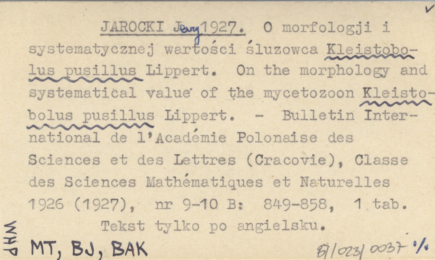JAROCKI Jerzy 1927 O morfologji i systematycznej wartości śluzowca Kleistobolus pusillus Lippert. On the morphology and systematical value of the mycetozoon Kleistobolus pusillus Lippert.
