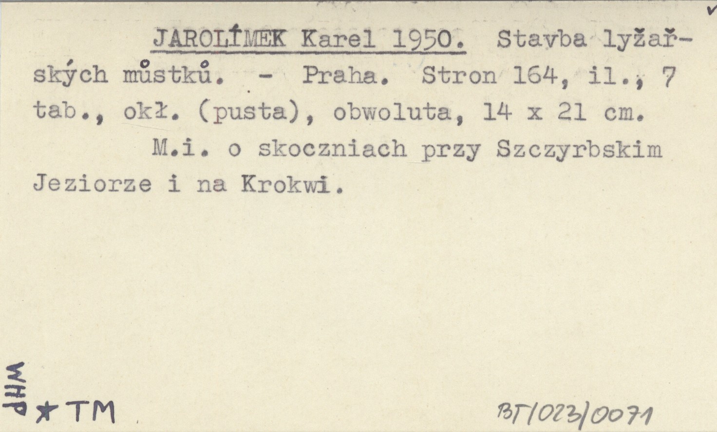 Praha , 164 s., il., 7 k., okł. (pusta), obw., 14x21 cm. M. in. o skoczniach przy Szczyrbskim Jeziorze i na Krokwi.