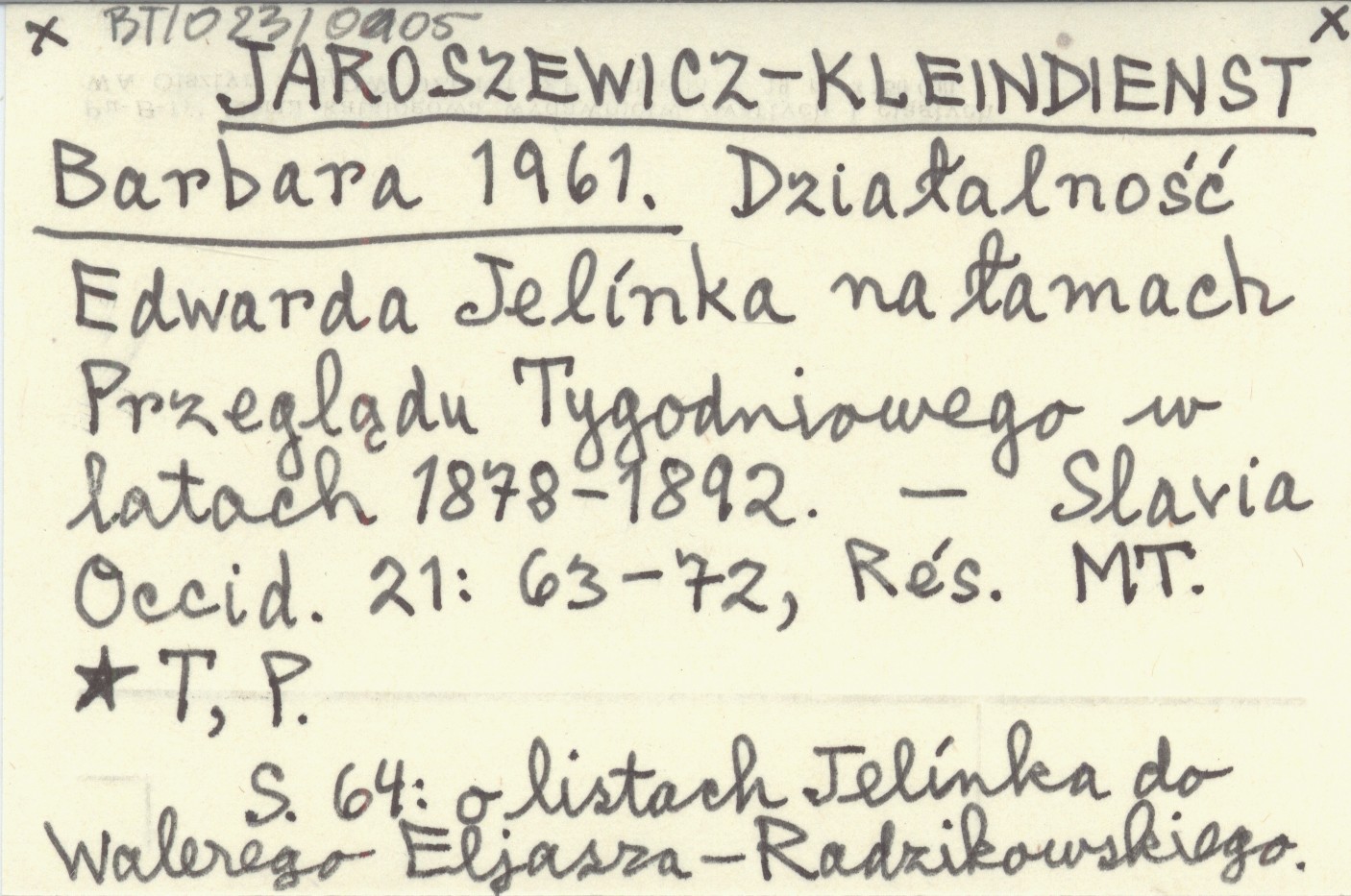 Slavia Occid., 21: 63-72, Rés. S. 64: o listach Jelínka do Walerego Eljasza-Radzikowskiego.