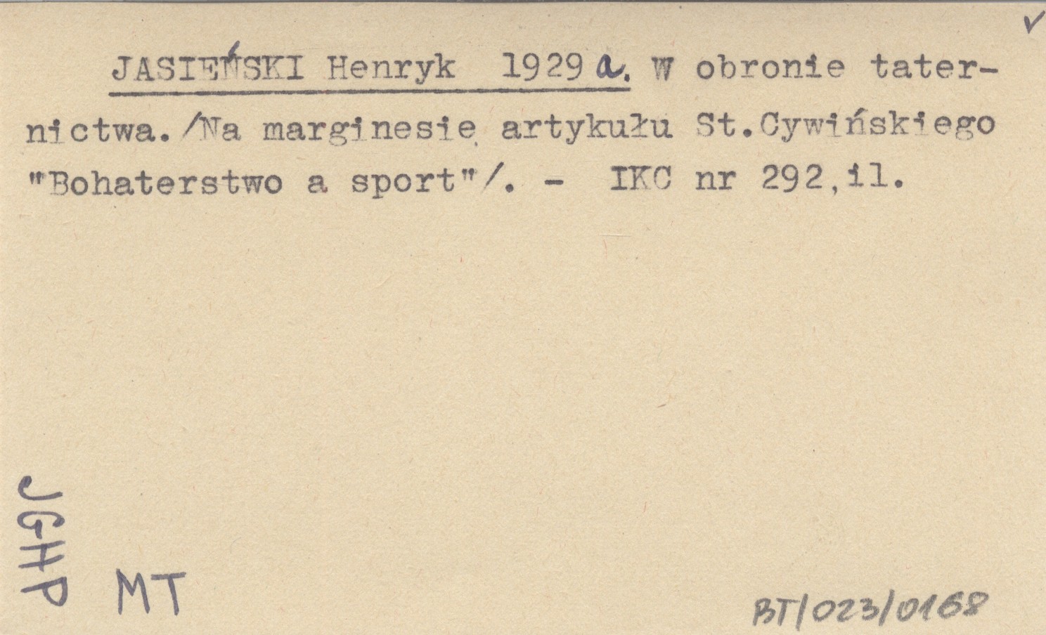 JASIEŃSKI Henryk 1929 a W obronie taternictwa. /Na marginesie artykułu St. Cywińskiego "Bohaterstwo a sport"/.