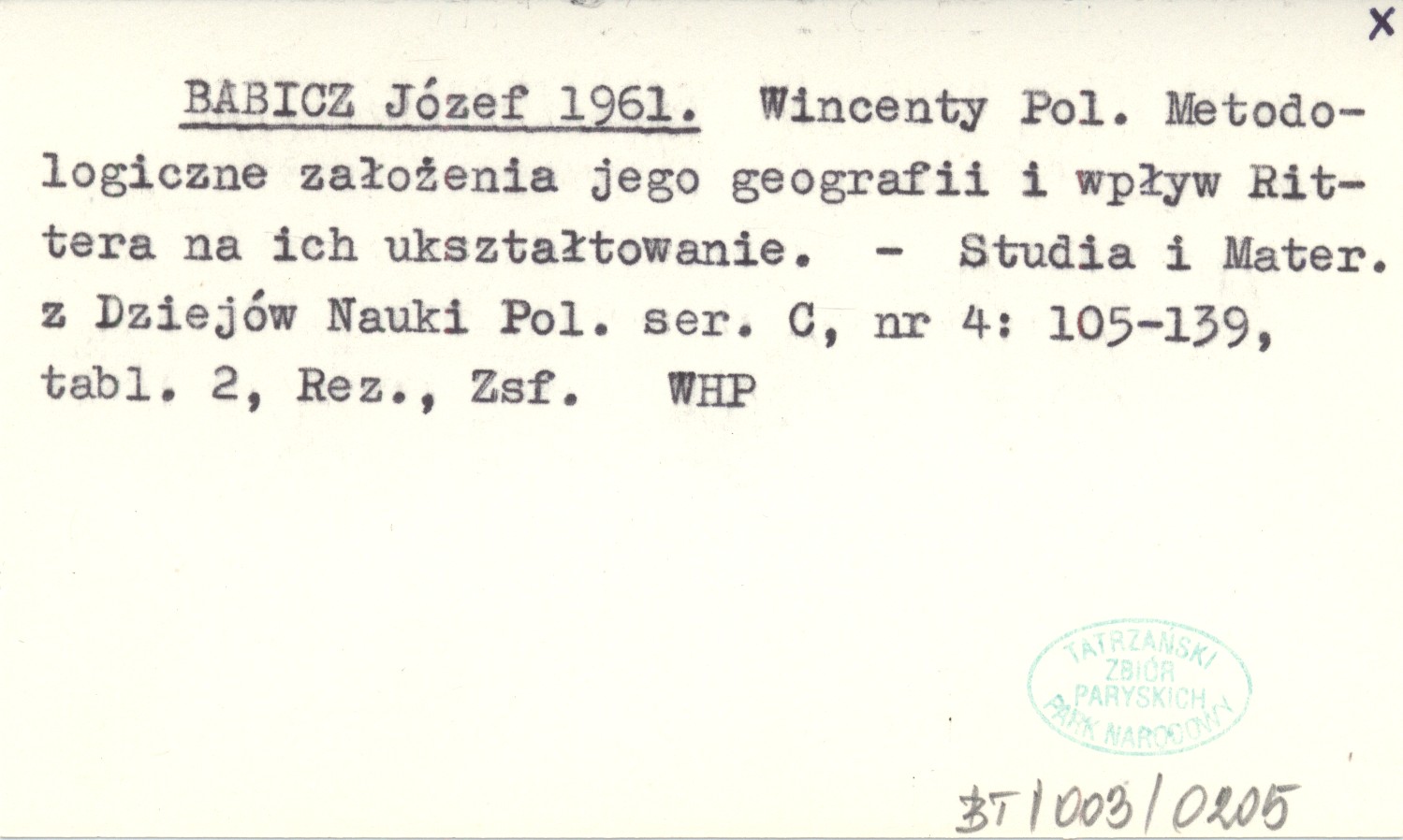 BABICZ Józef 1961 Wincenty Pol. Metodologiczne założenia jego geografii i wpływ Rittera na ich ukształtowanie.
