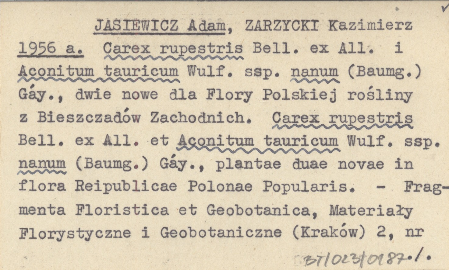 JASIEWICZ Adam ZARZYCKI, Kazimierz. ; 1956 a Carex rupestris Bell. ex All. i Aconitum tauricum Wulf. ssp. nanum (Baumg.) Gáy., dwie nowe dla Dlory Polskiej rośliny z Biesczadów Zachodnich. Carex rupestris Bell. ex All. et Aconitum tauricum Wulf. ssp. nanum (Baumg.) Gáy., plantae duae novae in flora Reipublicae Polonae Popularis.
