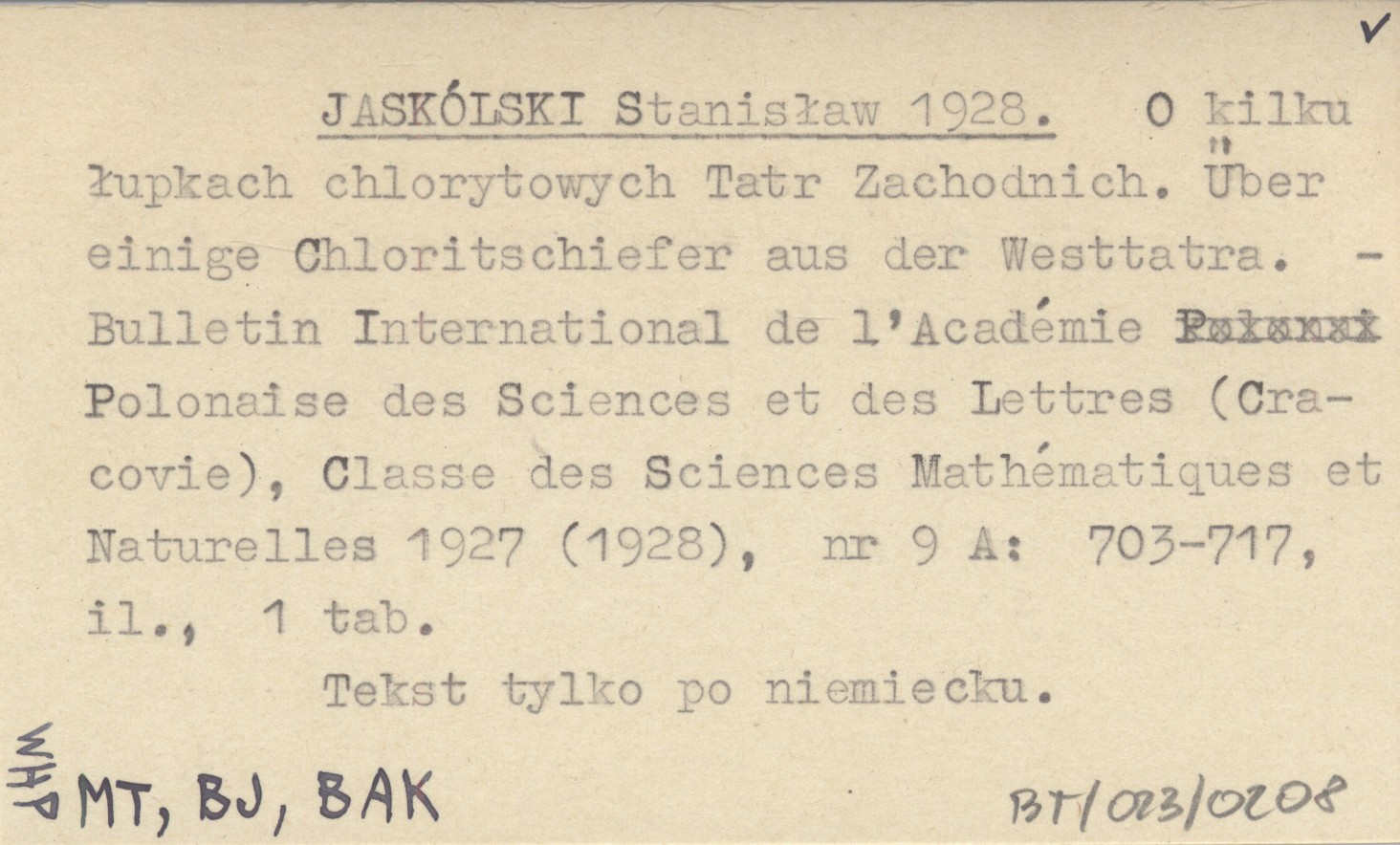 JASKÓLSKI Stanisław 1928 O kilku łupkach chlorytowych Tatr Zachodnich. Über einige Chloritschiefer aus der Westtatra.