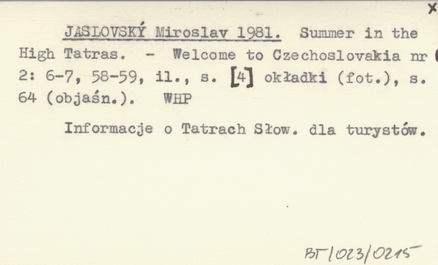 Welcome to Czechoslovakia, Nr 2: 6-7, 58-59, il., S. [4] okł. (fot.), S. 64 (obj.). Informacje o Tatrach Słowackich dla turystów.