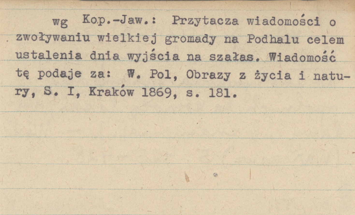 Wisła (Warszawa) , 5: 425-428. Wg Kop.-Jaw.: Przytacza wiadomości o zwoływaniu wielkiej gromady na Podhalu celem ustalenia dnia wyjścia na szałas. Wiadomość tę podaje za: W. Pol, Obrazy z życia i natury, S. I., Kraków 1869, S. 181.