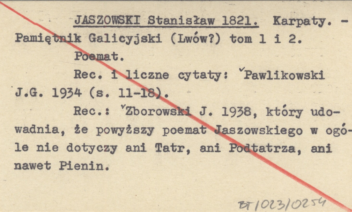 Pamiętnik Galicyjski (Lwów?) , T. 1, 2. Poemat REC: Pawlikowski J. G. 1934 (S. 11-18) (rec. i liczne cytaty). Zborowski J. 1938, który udowadnia, że powyższy poemat Jaszowskiego w ogóle nie dotyczy ani Tatr, ani Podtatrza, ani nawet Pienin.