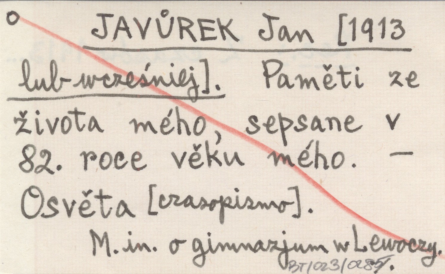 JAVŮREK Jan [1913?] Paměti ze života mého, sepsane v 82. roce věku mého.
