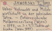 JAWORSKI Zygmunt (Sigmund) 1897 Ueber Viehzucht und Milchwirthschaft in der polnischen Tatra.