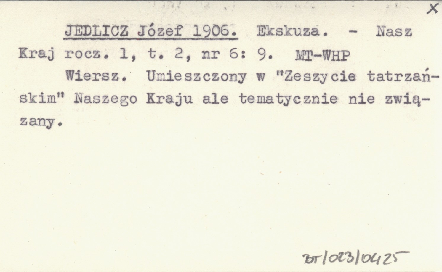 Nasz Kraj, R. 1, t. 2, nr 6: 9. Wiersz. Umieszczony w "Zeszycie tatrzańskim" Naszego Kraju ale tematycznie nie związany.
