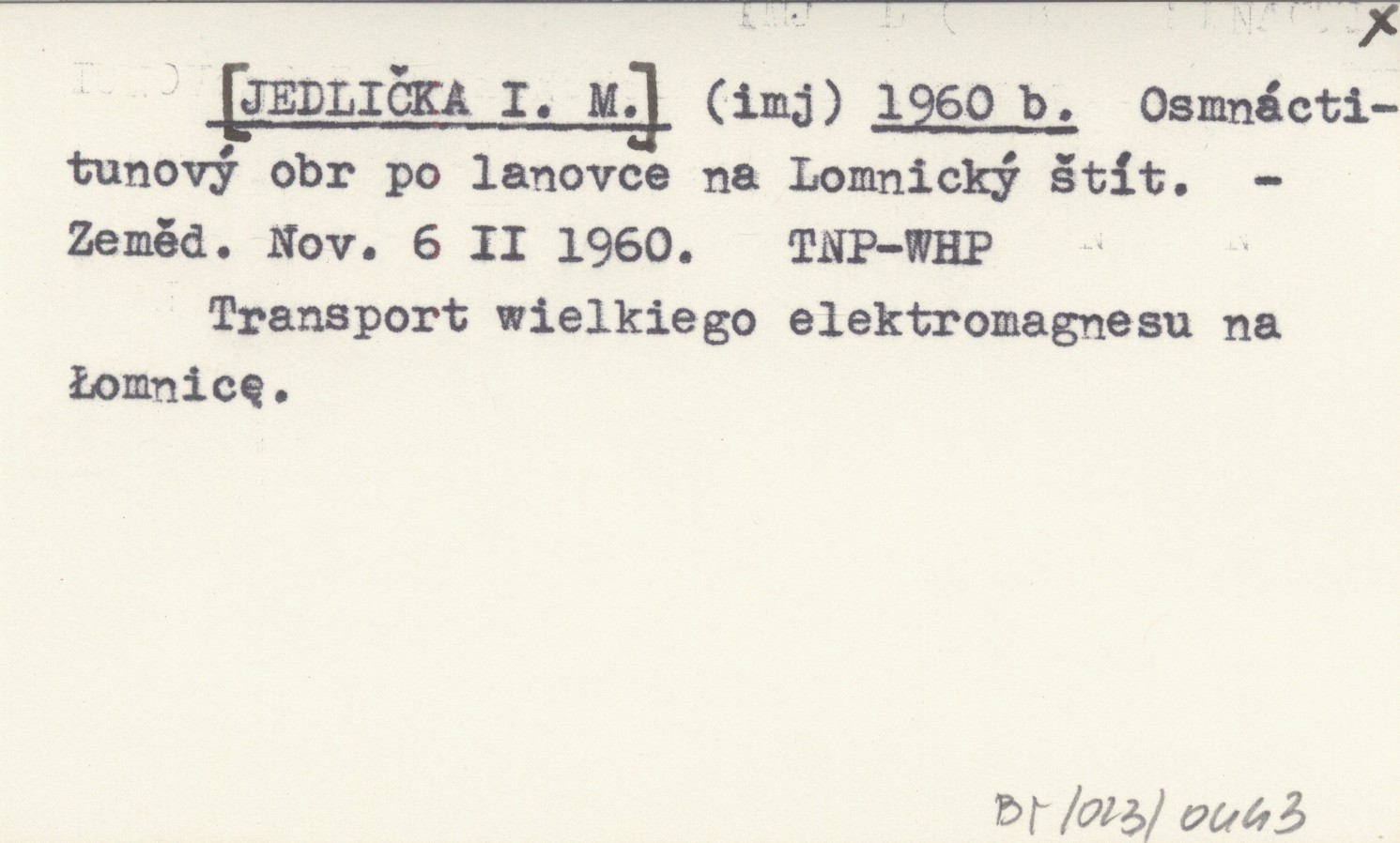 (imj) [JEDLIČKA I. M.] 1960 b Osmnáctitunový obr po lanovce na Lomnický štít.