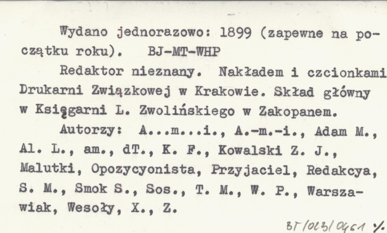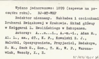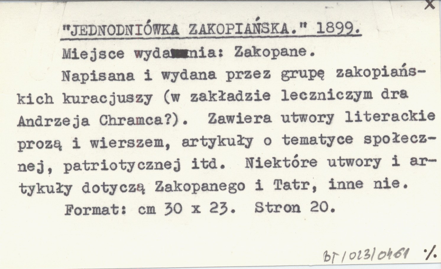 Miejsce wydania: Zakopane. Napisana i wydana przez grupę zakopiańskich kuracjuszy (w zakładzie leczniczym dra Andrzeja Chramca?). Zawiera utwory literackie prozą i wierszem, artykuły o tematyce społecznej itd. Niektóre utwory i artykuły dotyczą Zakopanego i Tatr, inne nie. Format: 30x23 cm. 20 s. Wydano jednorazowo: 1899 (zapewne na początku roku). Redaktor nieznany. Nakładem i czcionkami Drukarni Związkowej w Krakowie, Skład główny w Księgarni L. Zwolińskiego w Zakopanem. Autorzy: A...m...i., A.-m.-i., Adam M., Al. L., am., dT., K. F., Kowalski Z. J., Malutki, Opozycyonista, Przyjaciel, Redakcya, S. M., Smok S., Sos., T. M., W. P., Warszawiak, Wesoły, X., Z. REC: ZBOROWSKI J. ...