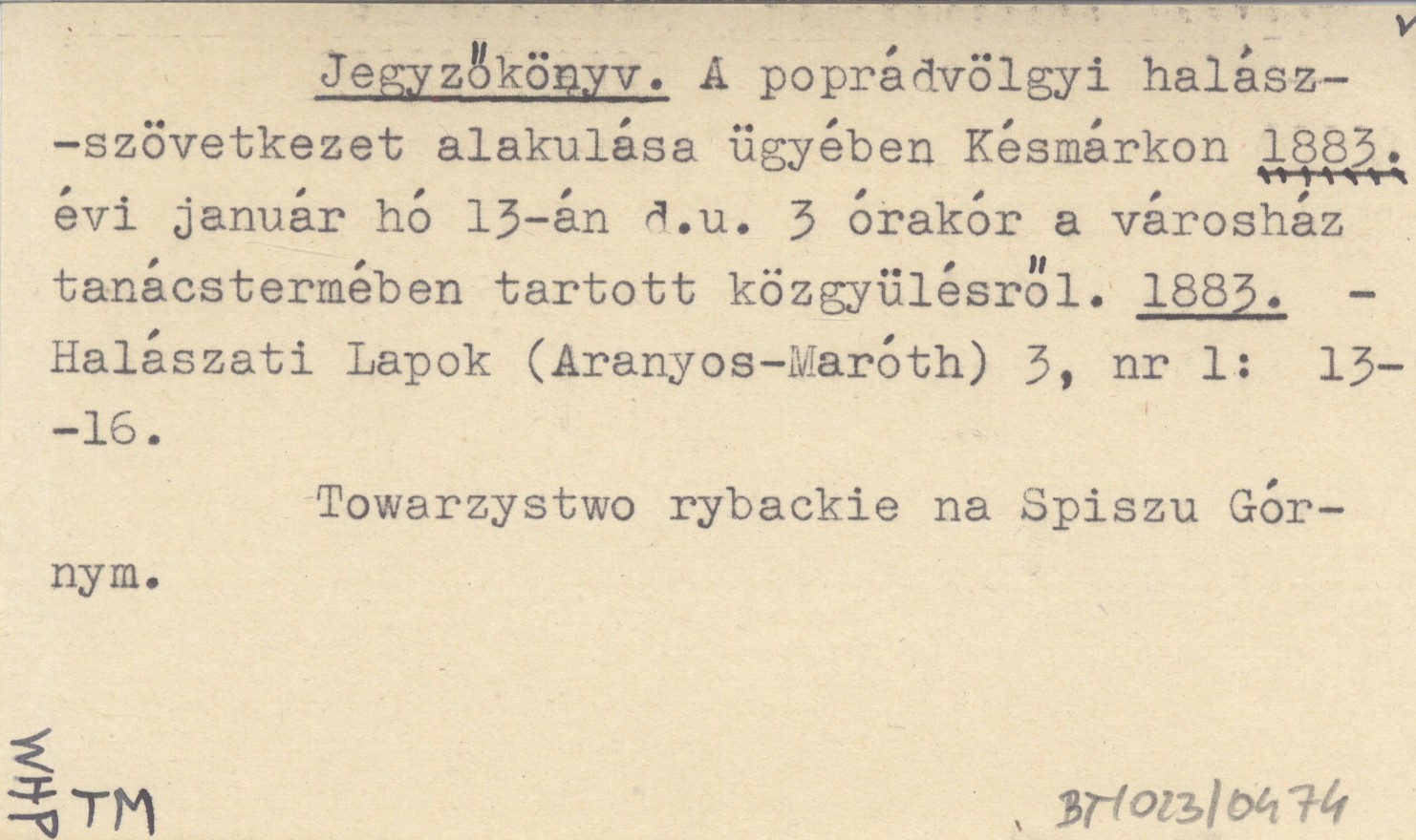Jegyzőkönyv. A poprádvölgyi halász-szövetkezet alakulása ügyében Késmárkon 1883. évi január hó 13-án d.u. 3 órakór a városház tanácstermében tartott közgyülésről. 1883