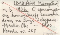 m. b. [BABIŃSKI Mieczysław] 1936 O sprawniejszą komunikację samochodową na linji Zakopane - Morskie Oko.